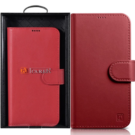 iCarer Wallet Case 2in1 etui iPhone 14 Plus skórzany pokrowiec z klapką Anti-RFID czerwony (WMI14220727-RD)
