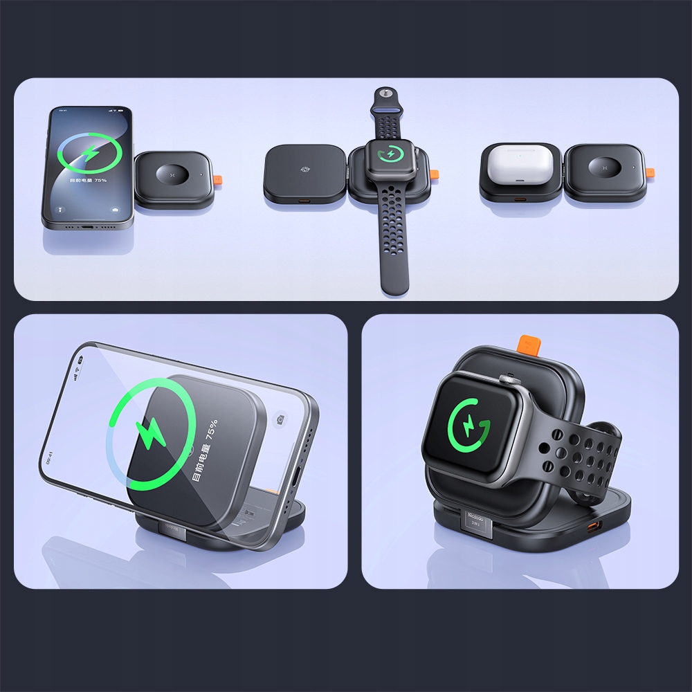 - Wielofunkcyjność 3w1 – Zawiera dwie niezależne ładowarki indukcyjne: 15W dla smartfona i słuchawek i 2,5W dla Apple Watch.