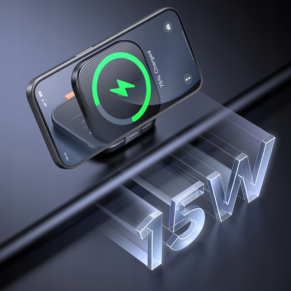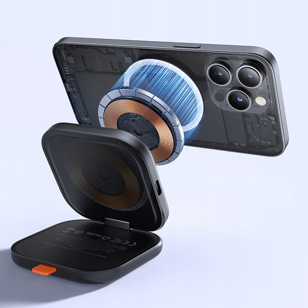 - Silne magnesy – Dzięki zastosowaniu opatentowanego układu magnesów Qi2, Twój smartfon będzie bezpiecznie trzymał się stacji, zapobiegając przypadkowemu upadkowi.