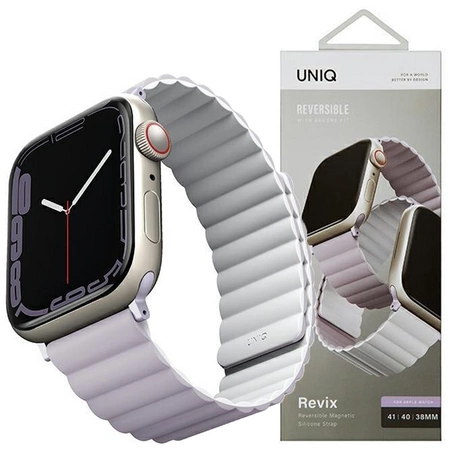 - 1 x UNIQ pasek Revix Apple Watch Series 4/5/6/7/8/SE/SE2 38/40/41mm. Reversible Magnetic lilak-biały/lilac-white
