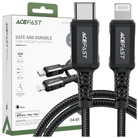 Kabel USB Typ C - Lightning do ładowania i przesyłania danych marki Acefast. Przeznaczony jest do urządzeń marki Apple ze złączem Lightning. Ma długość 180 cm i jest przystosowany do pracy z prądem o obciążeniu 30W i natężeniu 3A. Jest kompatybilny z szybkim ładowaniem Power Delivery. Posiada certyfikat MFI (Maide For iPhone), dzięki czemu telefon nie wyświetli komunikatu o nieoryginalnym akcesorium. Kabel na całej długości jest opleciony nylonem. Wtyczki posiadają aluminiową obudowę. Końcówki kabla posiadają osłony zapobiegające przed uszkodzeniem w miejscu najczęstszego zginania.