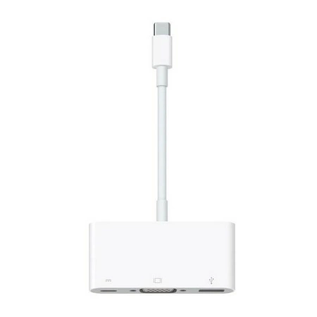 Wieloportowa przejściówka z USB-C na VGA pozwala podłączyć Maca z portem USB-C lub Thunderbolt 3 (USB-C) do wyświetlacza VGA, przy jednoczesnym podłączeniu standardowego urządzenia USB i przewodu zasilającego USB-C. Przejściówka pozwala klonować obraz z Maca na ekranie telewizora lub wyświetlacza z interfejsem VGA w jakości do 1080p HD. Umożliwia również przesyłanie materiałów wideo, takich jak filmy i nagrane klipy. Wystarczy podłączyć ją do portu USB-C lub Thunderbolt 3 (USB-C) w Macu, a następnie do telewizora lub projektora za pośrednictwem kabla VGA (sprzedawanego osobno). Do standardowego portu USB można podłączać urządzenia, takie jak napęd flash czy aparat fotograficzny, albo kabel USB do synchronizowania i ładowania iPhone, iPada lub iPoda. A żeby naładować Maca, wystarczy podłączyć kabel zasilający do portu USB-C. Wymaga kabla VGA (sprzedawanego osobno) w celu podłączenia do odbiornika TV lub projektora.