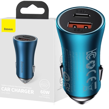 Baseus Golden Contactor Max szybka ładowarka samochodowa USB + USB typu C 60 W Quick Charge niebieski (CGJM000103)