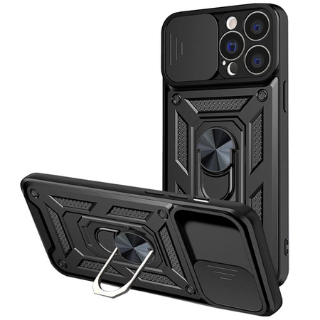 Pancerne etui z serii Hybrid Armor Camshield jest wykonane z termoplastycznego i wytrzymałego tworzywa, które swoim wyglądem imituje stal. Pokrowiec jest dopasowany do iPhone 13 Pro Max, doskonale chroni telefon przed zniszczeniami wskutek upadków lub zarysowań (na przykład przez noszone w kieszeni klucze). Pokrowiec posiada przesuwaną osłonę na tylny aparat. Dzięki niej szkło kamery jest chronione przed porysowaniem. Jest do też dodatkowy plus dla osób ceniących prywatność i bezpieczeństwo swoich danych. Zakryta kamera uniemożliwia dostęp do nagrywania obrazu w przypadku kiedy ktoś uzyska zdalny dostęp do telefonu i włączy podgląd z głównej kamery. Podniesione krawędzie dookoła ekranu zabezpieczają go od zarysowania kiedy ten leży na płaskiej powierzchni. Ma wbudowany metalowy ring, który pozwala na wygodne korzystanie z telefonu jedną ręką i pełni również funkcję podstawki. Wbudowana metalowa płytka sprawia, że można go przymocować do magnetycznych uchwytów samochodowych. Posiada responsywne przyciski i wycięcia na porty. Idealny dla osób, które cenią sobie styl, jakość i chcą zadbać o swoje urządzenie.