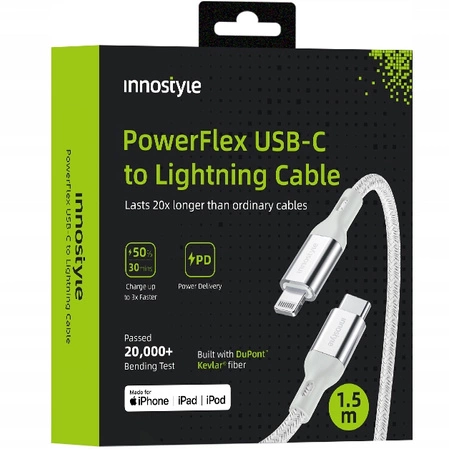 - Jak długo kabel wytrzyma intensywne codzienne użytkowanie - Nasz kabel Innostyle PowerFlex jest wyposażony w wytrzymałe włókno Kevlar, co czyni go niezwykle odpornym na zginanie. PowerFlex przeszedł test 20,000 zgięć. Dzięki temu jest aż 20 razy trwalszy niż standardowe kable, gwarantując Ci niezawodność i długowieczność, nawet przy najbardziej intensywnym użytkowaniu.