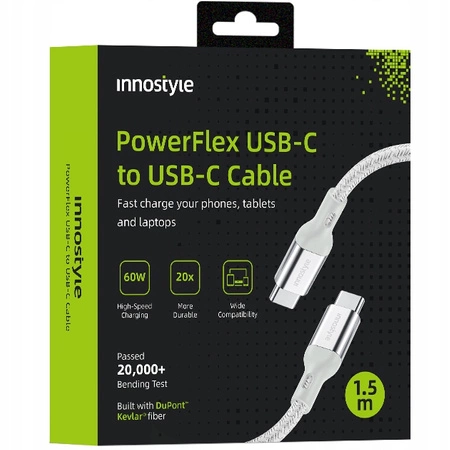 - Jak długo kabel wytrzyma intensywne codzienne użytkowanie - Nasz kabel Innostyle PowerFlex jest wyposażony w wytrzymałe włókno Kevlar, co czyni go niezwykle odpornym na zginanie. PowerFlex przeszedł test 20,000 zgięć. Dzięki temu jest aż 20 razy trwalszy niż standardowe kable, gwarantując Ci niezawodność i długowieczność, nawet przy najbardziej intensywnym użytkowaniu.