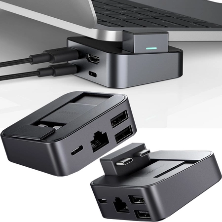 HUB posiada do wykorzystania 8 portów, do których można podłączyć np. klawiaturę, mysz, dysk twardy, kabel sieciowy lub kabel HDMI.