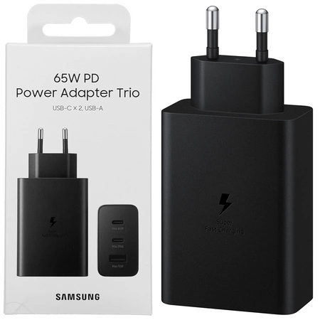 - - Oryginalna, bardzo szybka ładowarka sieciowa Samsung o mocy 65W.- 1xUSB-C (65W MAX) / 1xUSB-C (25W MAX) / 1xUSB-A (15W MAX)- Ładowarka wykorzystuje technologię Power Delivery, aby zapewnić szybkie i skuteczne ładowanie- Kompaktowy i lekki design